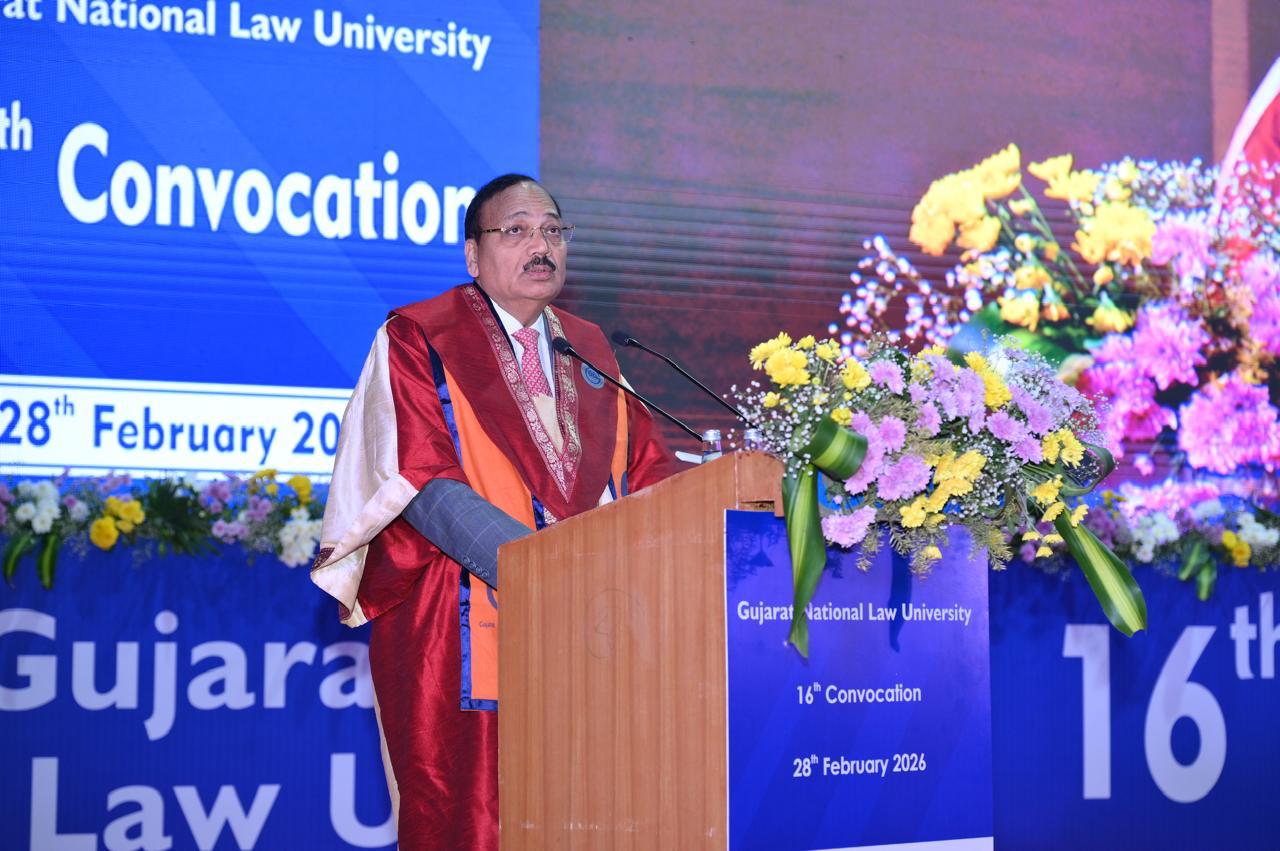 Gandhinagar, February 28: The Chief Justice of India, Surya Kant, on Friday delivered a profound and reflective keynote address at the convocation ceremony of Gujarat National Law University (GNLU), Gandhinagar, urging young advocates to embrace professional specialisation, ethical integrity, and discipline-driven practice as the cornerstones of a meaningful legal career.
